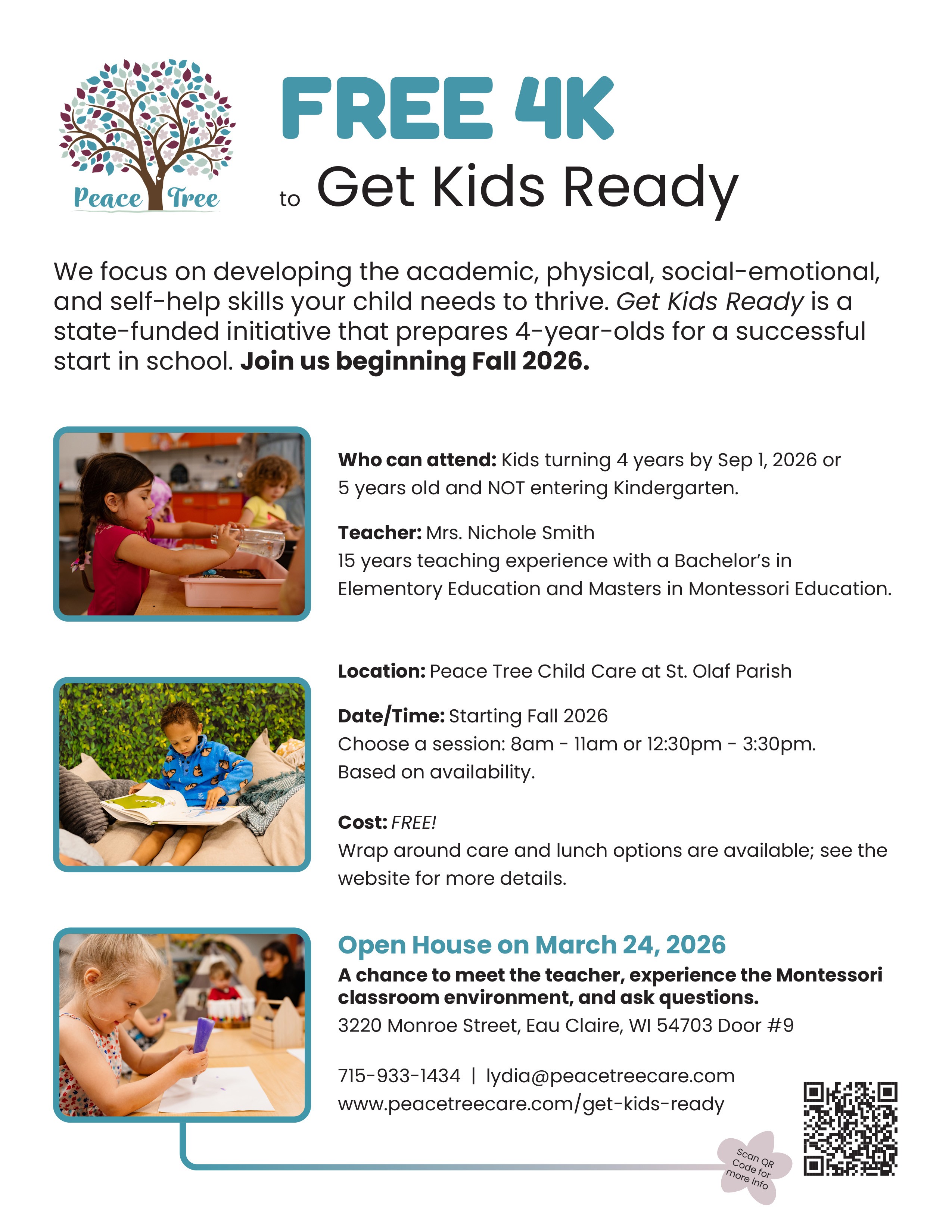 Promotional flyer for Peace Tree’s FREE 4K program to support enrollment and introduce families to the Get Kids Ready initiative.