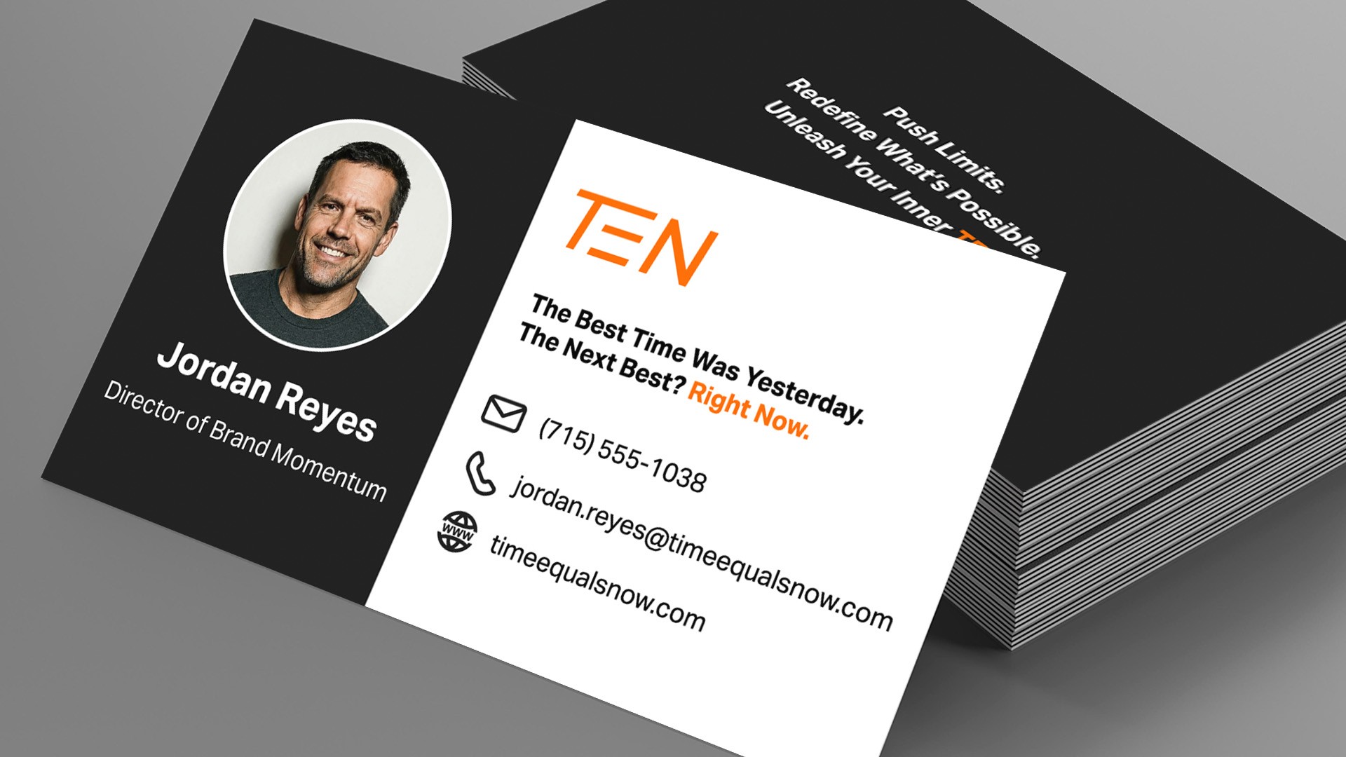 A sharp, two-sided business card that pairs a professional portrait with TEN's confident visual style, creating a memorable and energetic first impression.