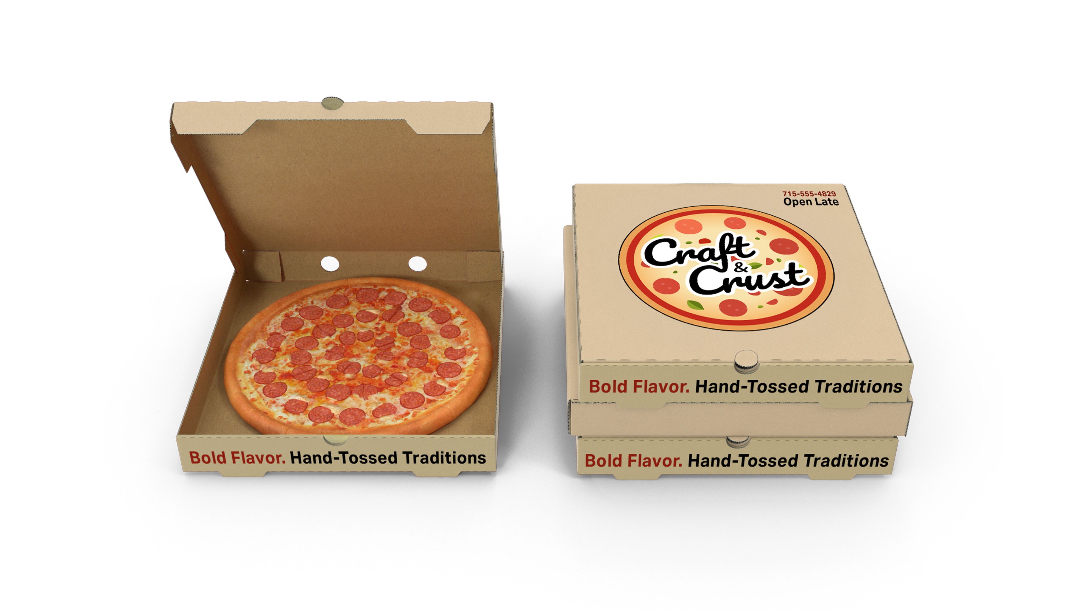 A 3D rendering that highlights the Craft & Crust pizza box design, including the logo and tagline,. This project provides a realistic look at the final packaging before production